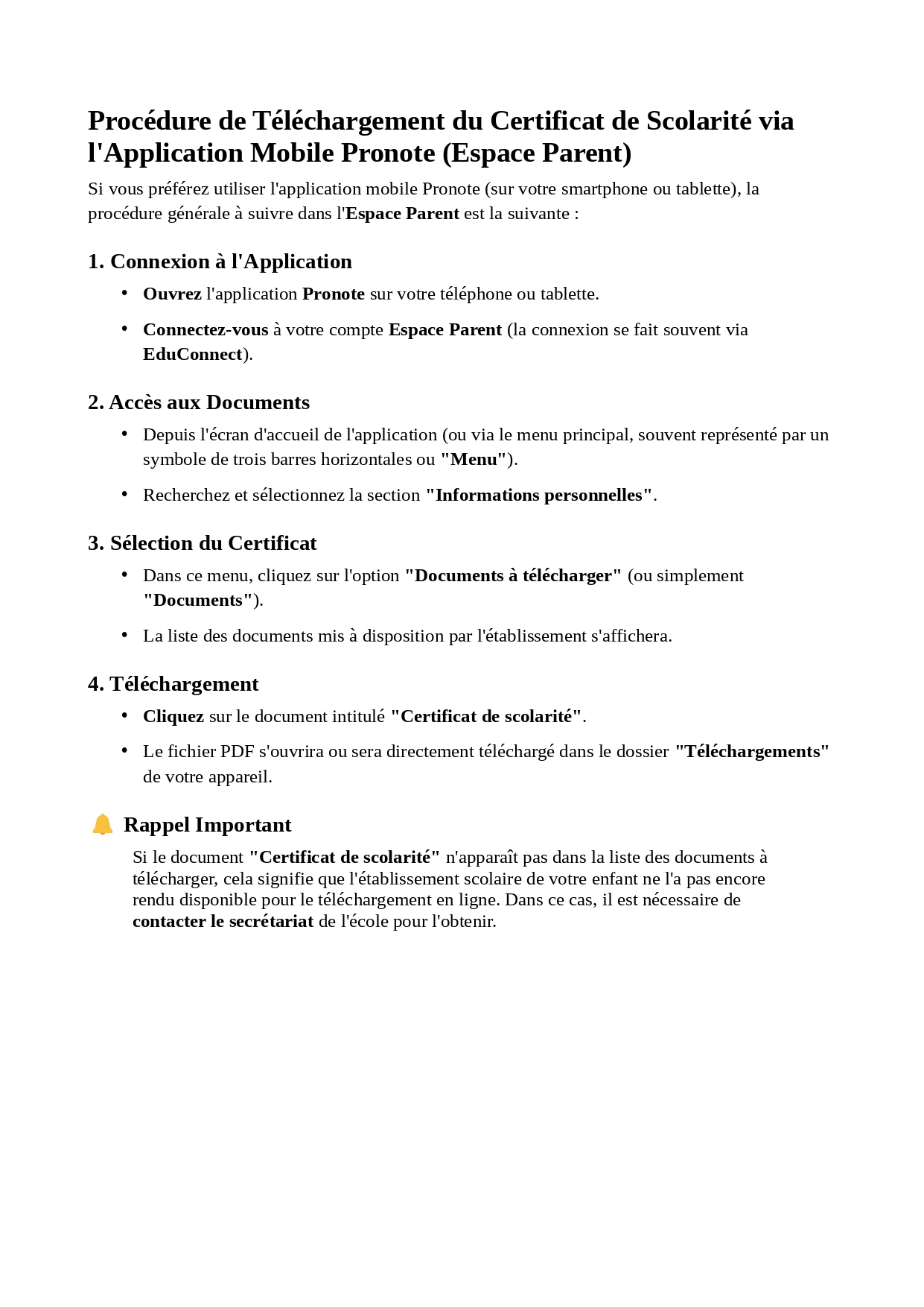 Procédure de Téléchargement du Certificat de Scolarité via l'Application Mobile Pronote (Espace Parent)